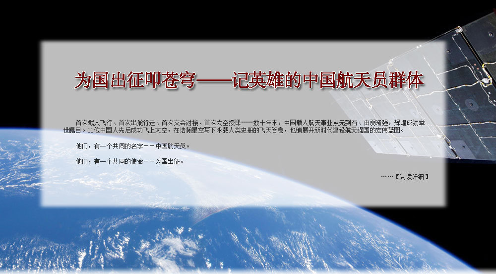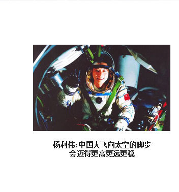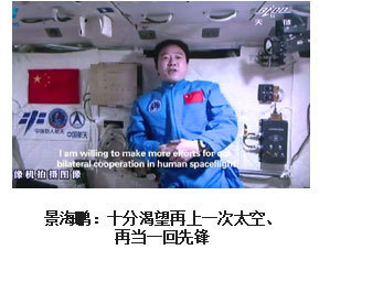 ??? 為了人類的和平與進(jìn)步,中國(guó)人來(lái)到了太空。2003年10月15日,我搭乘神舟五號(hào)飛船,在太空飛行14圈,歷時(shí)21小時(shí)23分,完成了中國(guó)首次載人航天飛行。雖然是獨(dú)自在太空飛行,但一想到億萬(wàn)祖國(guó)人民翹首以待,我覺(jué)得不是一個(gè)人在飛。于是我拿起太空筆,在工作日志的背面寫(xiě)上了這樣一句話:“為了人類的和平與進(jìn)步,中國(guó)人來(lái)到了太空”,并在艙內(nèi)鏡頭前向祖國(guó)人民、世界人民展示。“為了人類的和平與進(jìn)步”,是中國(guó)發(fā)展載人航天事業(yè)的初衷,“中國(guó)人來(lái)到了太空”既描述了一個(gè)歷史時(shí)刻,也表達(dá)了我為祖國(guó)航天事業(yè)感到無(wú)比自豪的心情。?