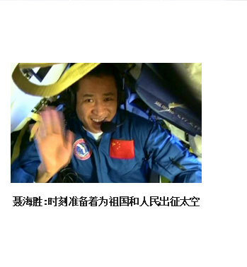 ??? 時(shí)刻準(zhǔn)備著,將祖國(guó)的榮耀一次次寫(xiě)滿太空。在我加入航天員大隊(duì)后,有2件事深深地烙在我的腦海中。一是,一位老華僑在神舟五號(hào)任務(wù)成功后,含淚而說(shuō)的“你們航天員飛得有多高,我們海外游子的頭就能昂多高”。二是,我們面對(duì)國(guó)旗許下的誓言,“為祖國(guó)的載人航天事業(yè)奮斗終身”。我始終以嚴(yán)慎細(xì)實(shí)的精神,以時(shí)不我待的狀態(tài),腳踏實(shí)地、努力學(xué)習(xí)、刻苦訓(xùn)練,以實(shí)際行動(dòng)踐行諾言,用一生的執(zhí)著與追求,時(shí)刻準(zhǔn)備著,將祖國(guó)的榮耀一次次寫(xiě)滿太空!?