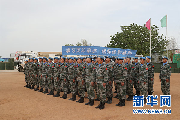 祭奠儀式上,大型機(jī)械鳴笛三聲,哀思樂(lè)曲響起,全體官兵整裝列隊(duì),集體脫帽為犧牲在維和戰(zhàn)場(chǎng)上的英烈默哀三分鐘。隨后,官兵代表致辭,追憶維和英烈們無(wú)私奉獻(xiàn)、舍生取義的光輝事跡,表達(dá)為達(dá)爾富爾地區(qū)和平建設(shè)而努力奮斗的堅(jiān)定決心。