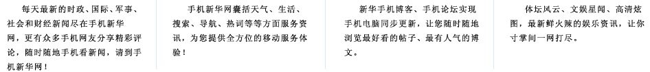 手機新華網是新華網的手機無線門戶網站,是中國最具權威的免費手機新聞網站之一。歡迎各地電信運營商以及廣告界、企業界、商務界、傳媒界等各界人士與我們聯系,精誠合作,實現共贏。電話:010-63070908,E-mail:xhsjb@xinhuanet.com