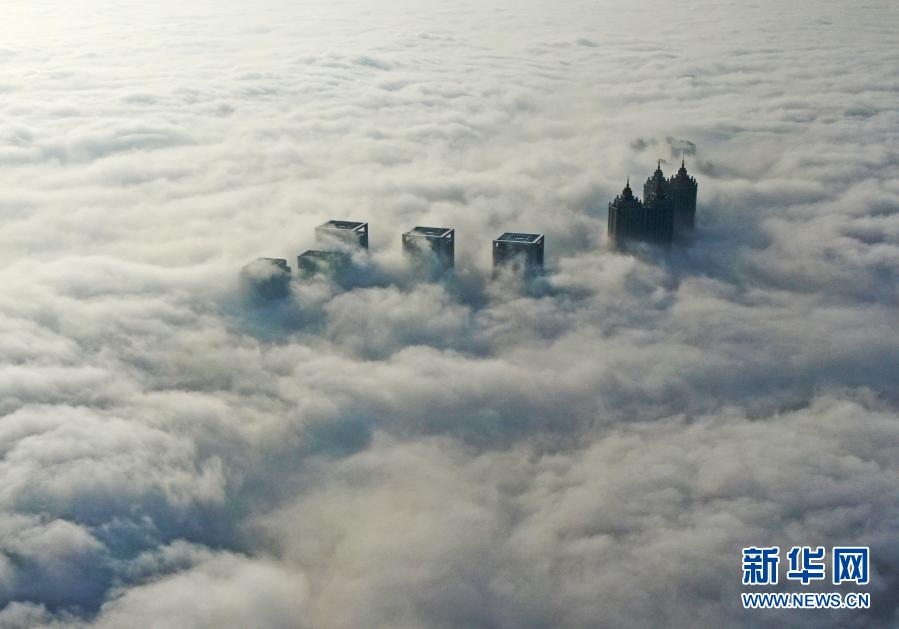 這是1月26日在沈陽市渾南區拍攝的市內霧景(無人機照片)。當日,沈陽出現大霧天氣,城市樓宇在濃霧中若隱若現。新華社記者 楊青 攝