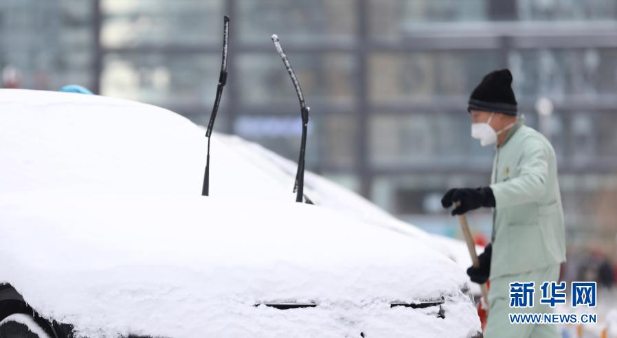 1月28日,在沈陽市渾南區,一名工作人員清掃停車場積雪。