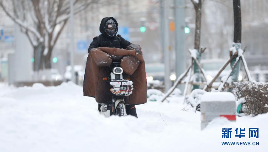 1月28日,在沈陽市渾南區,市民在積雪中騎行。