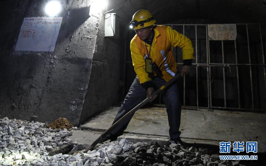 看守工廖成根在鄧山隧道內用鐵鏟清除水溝內的涌沙(1月30日攝)。