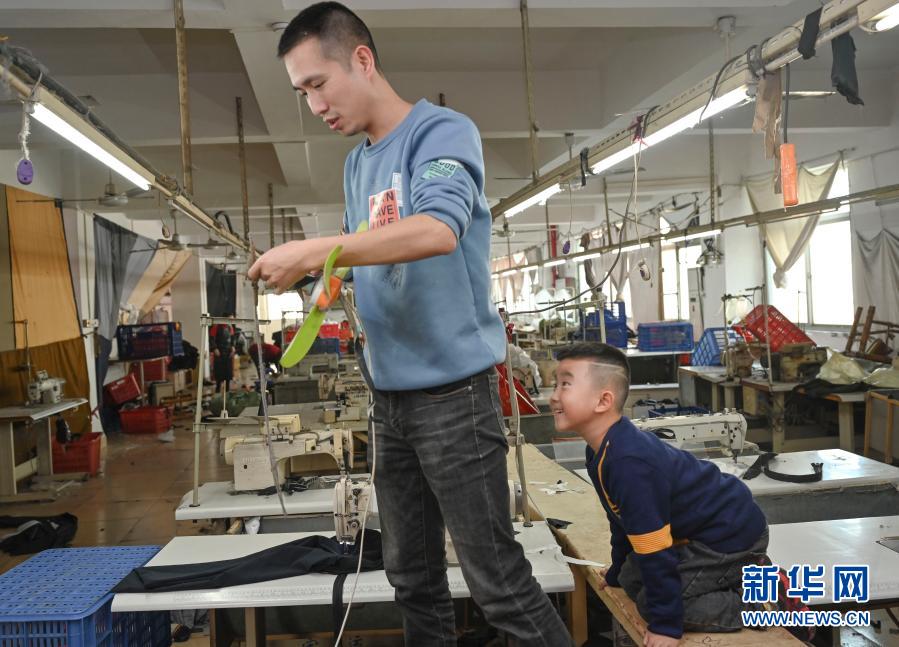 1月26日,在福建省石獅市的金利萊斯服裝廠,聰聰與正在收拾工位的黃海龍開玩笑。