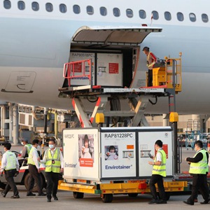 2月19日,在香港國際機場,工作人員將裝載疫苗的貨柜箱送往指定地點進行儲存。新華社記者 李鋼 攝