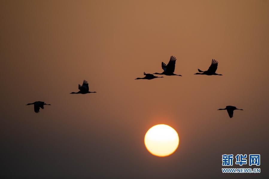 日出時分,黑頸鶴在大山包黑頸鶴國家級自然保護區飛翔(2月27日攝)。新華社記者 胡超 攝