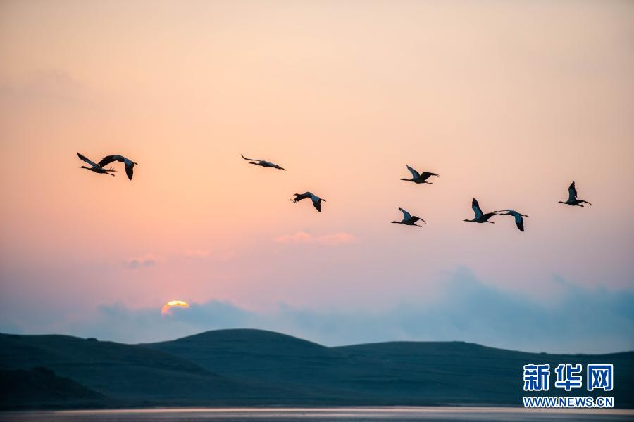 日出時分,黑頸鶴在大山包黑頸鶴國家級自然保護區(qū)飛翔(2月25日攝)。新華社記者 胡超 攝