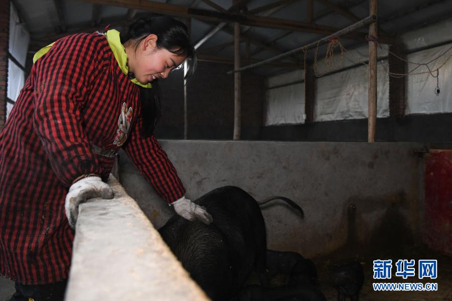 張志菊在自家農場里的豬圈里喂豬(2月25日攝)。
