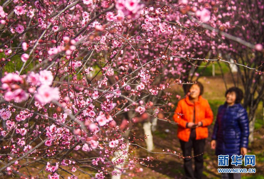 3月2日,游客在河南省南陽市梅城公園觀賞綻放的梅花。新華社發(高嵩 攝)