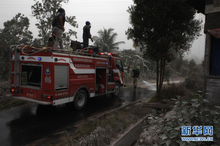 3月2日,印度尼西亞北蘇門答臘省卡羅的消防員清洗被火山灰覆蓋的道路。