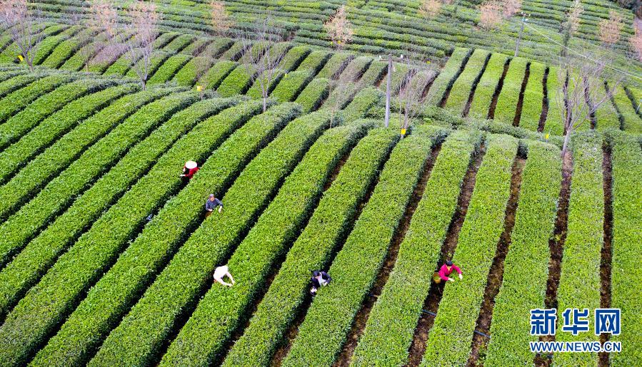3月4日,茶農在安康市漢濱區流水鎮剛子茶葉專業合作社標準化茶園采摘新茶(無人機照片)。新華社記者 陶明 攝