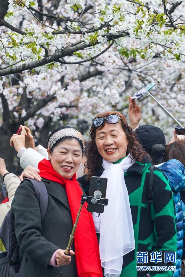 3月16日,市民游客在南京雞鳴寺路的櫻花下自拍留影。