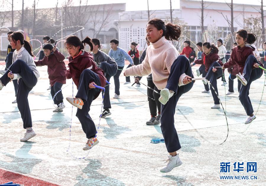 騎路小學的學生們在體育課上練習“左單腿下直搖跳”(3月10日攝)。新華社記者 楊磊 攝