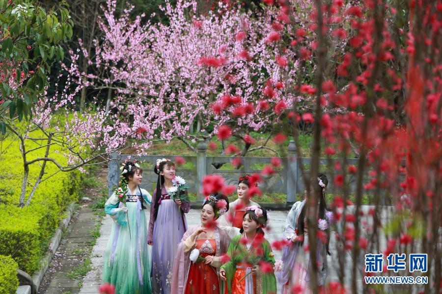 3月20日,在湖北省襄陽市黃家灣景區,漢服愛好者踏青賞花。