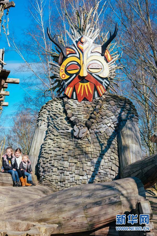 3月20日,孩子們在比利時博姆市的德舒爾森林公園與“巨人”雕塑合影。新華社記者 張鋮 攝
