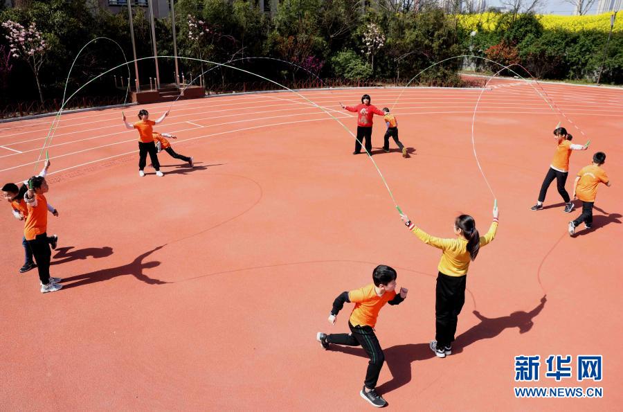 3月23日,在合肥市大通路小學新海校區,學生在大課間練習花樣跳繩。