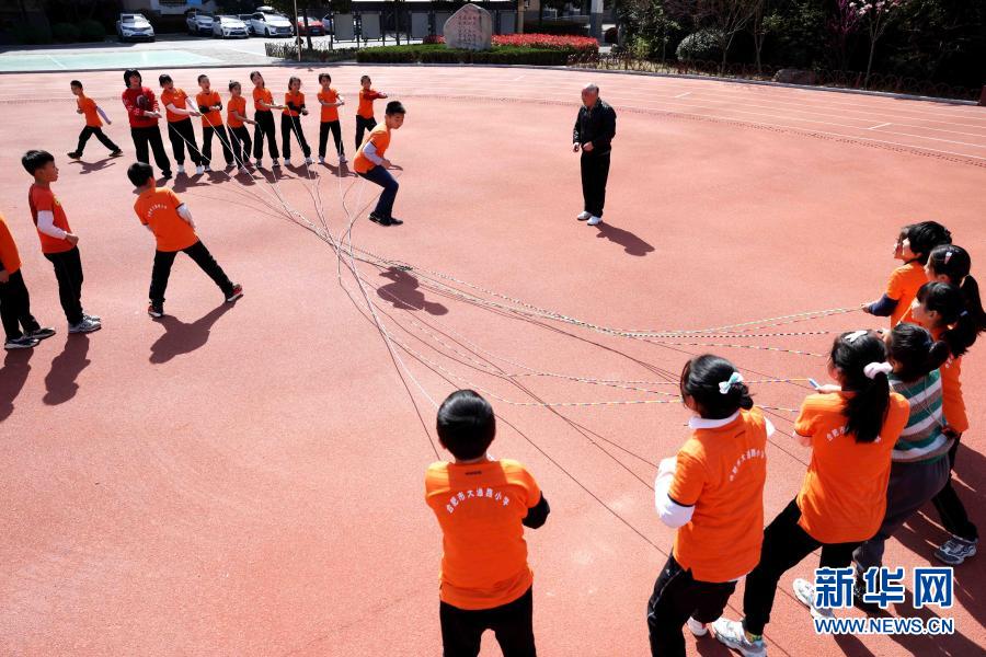 3月23日,在合肥市大通路小學新海校區,學生在大課間練習花樣跳繩。