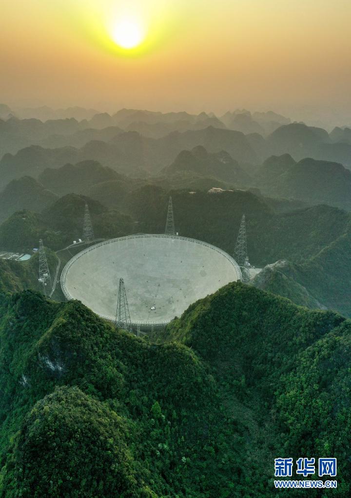 3月29日拍攝的晚霞中的“中國天眼”全景(維護(hù)保養(yǎng)期間拍攝,無人機(jī)照片)。