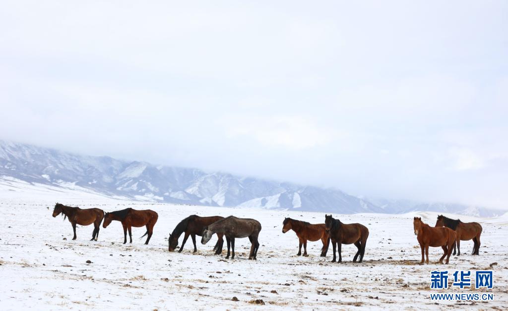 當日,受冷空氣影響,位于甘肅省河西走廊中部、祁連山北麓的山丹馬場降雪,馬群在雪原上奔跑覓食,構成了一幅壯美高原雪景 。