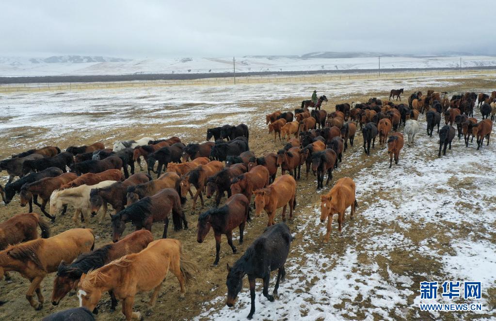 3月31日在山丹馬場拍攝的風(fēng)雪中的馬群(無人機照片)。