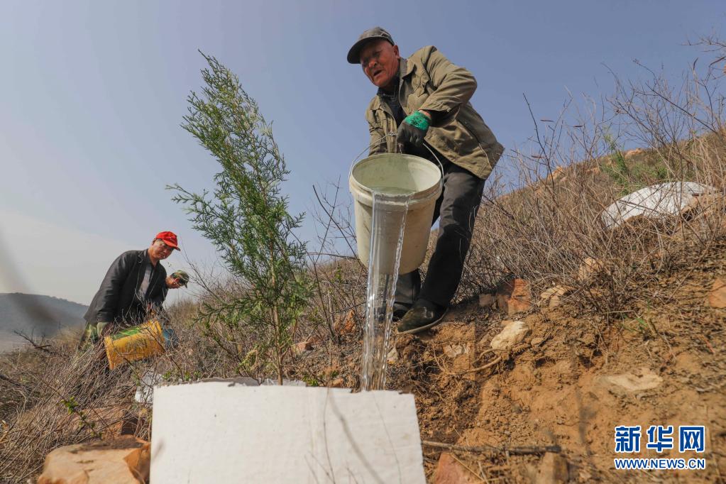 3月31日,造林隊(duì)員在河北省遵化市石門(mén)鎮(zhèn)金星山給新栽的樹(shù)苗澆水。