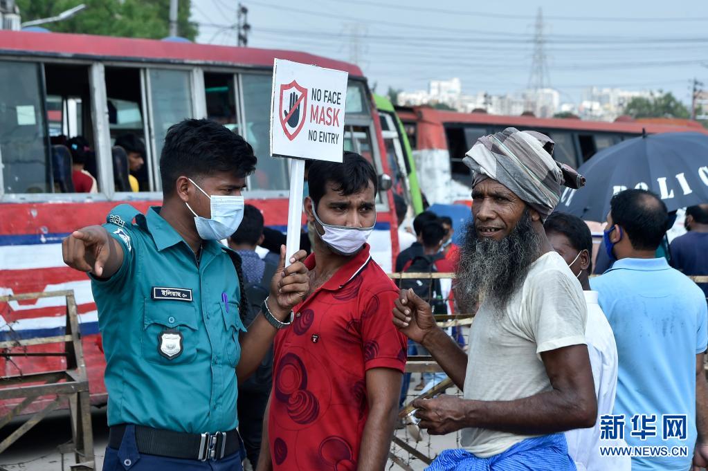 5月17日,警察在孟加拉國首都達卡的車站手舉佩戴口罩的提示牌,要求從各地返回達卡的人們注意防護安全。