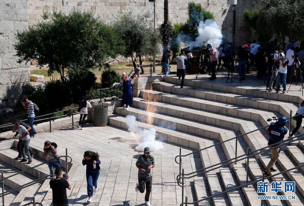 5月18日,巴勒斯坦民眾在耶路撒冷躲避以方發射的震爆彈。
