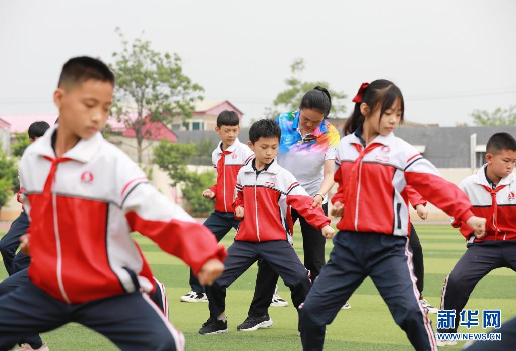 5月19日,邢臺市內(nèi)丘縣實驗小學(xué)學(xué)生在體育教師的指導(dǎo)下練習(xí)武術(shù)操。