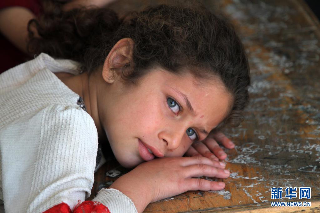 5月19日,受空襲影響而逃離家園的7歲巴勒斯坦兒童巴斯馬·阿布·拉薩斯在加沙城的一所學(xué)校臨時(shí)棲身。