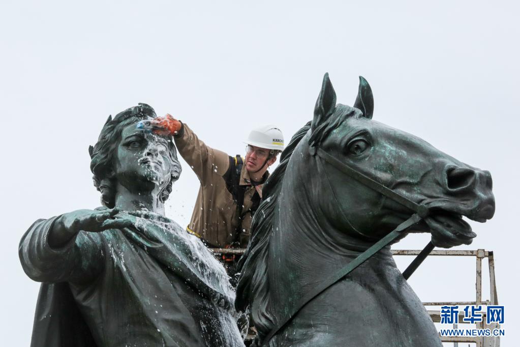 5月26日,工作人員在俄羅斯圣彼得堡清潔“青銅騎士”雕像。