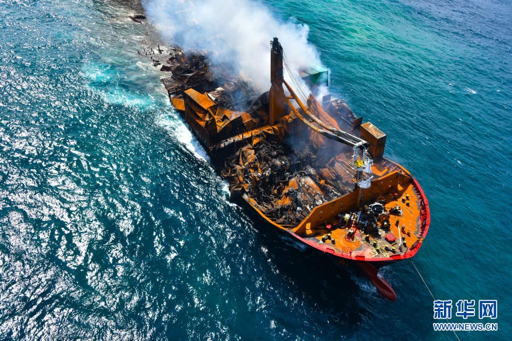 這是6月2日在斯里蘭卡科倫坡港附近拍攝的逐漸下沉的起火貨船“X-PRESS PEARL”號。