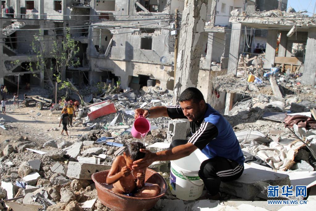 6月7日,在加沙地帶北部拜特哈嫩,一名巴勒斯坦人在遭以軍空襲損毀的建筑廢墟上給孩子洗澡。