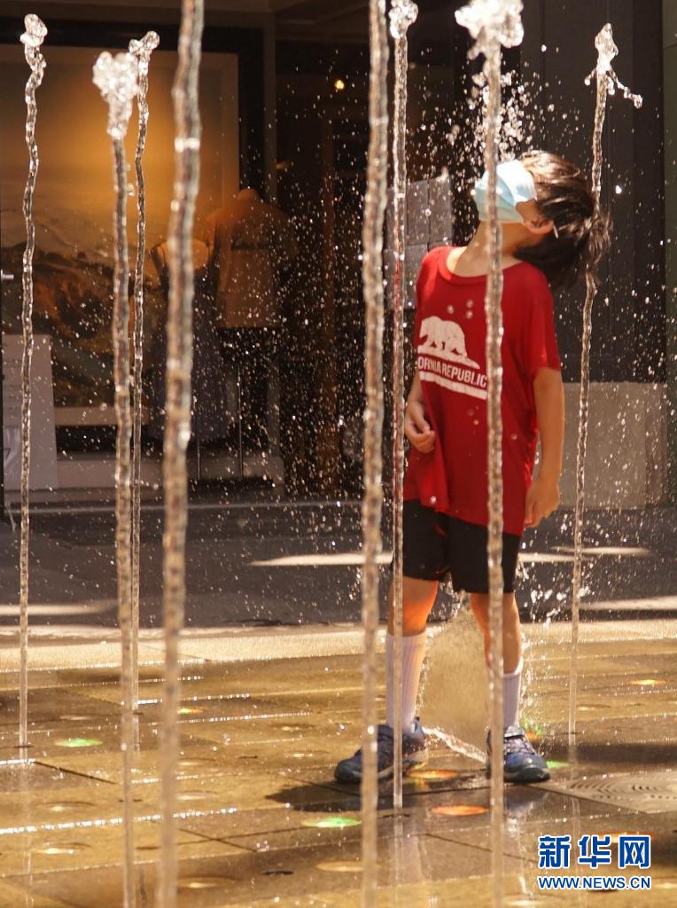 6月16日,美國加利福尼亞州洛杉磯市民在噴泉中戲水納涼。加州南部本周迎來今年的首次高溫天氣。