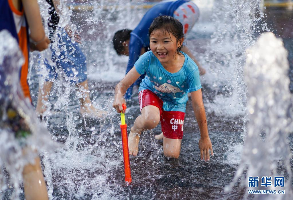 6月20日,孩子們在北京華熙LIVE·五棵松商業(yè)街區(qū)一處噴泉戲水。
