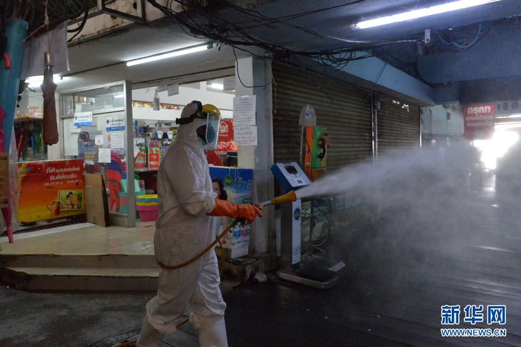 6月21日,工作人員在泰國首都曼谷一處生鮮市場進行消毒。