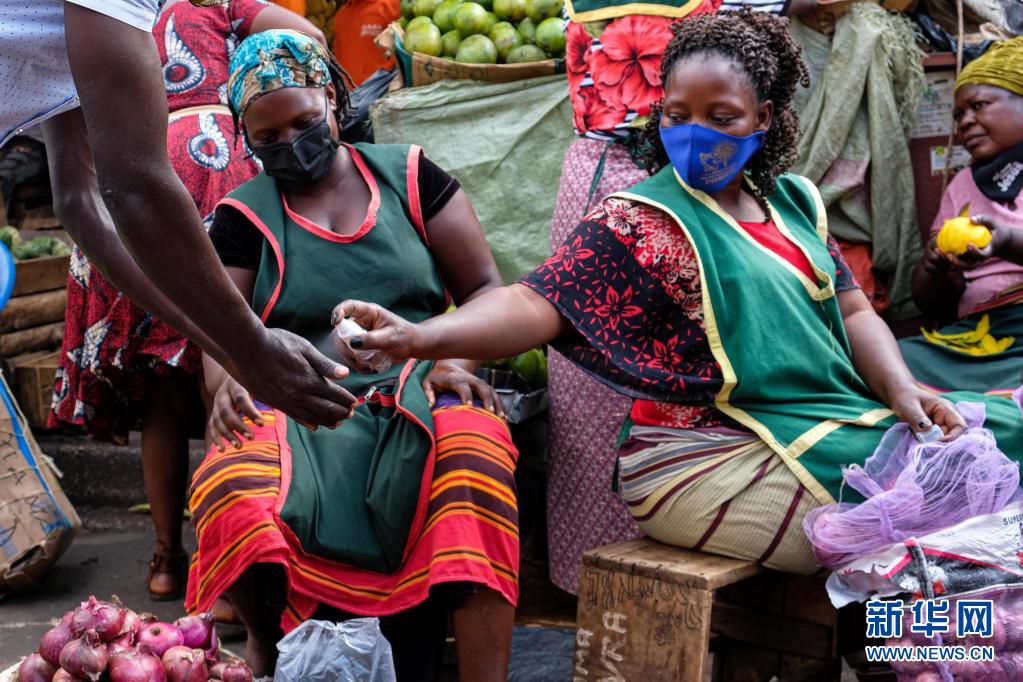 6月23日,商販在烏干達坎帕拉的納卡塞羅市場給顧客噴灑手部消毒液。