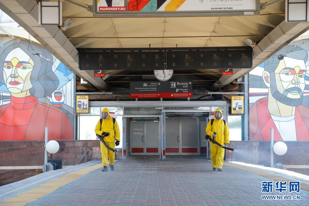 6月24日,工作人員身著防護服在俄羅斯莫斯科一個火車站進行消毒作業。