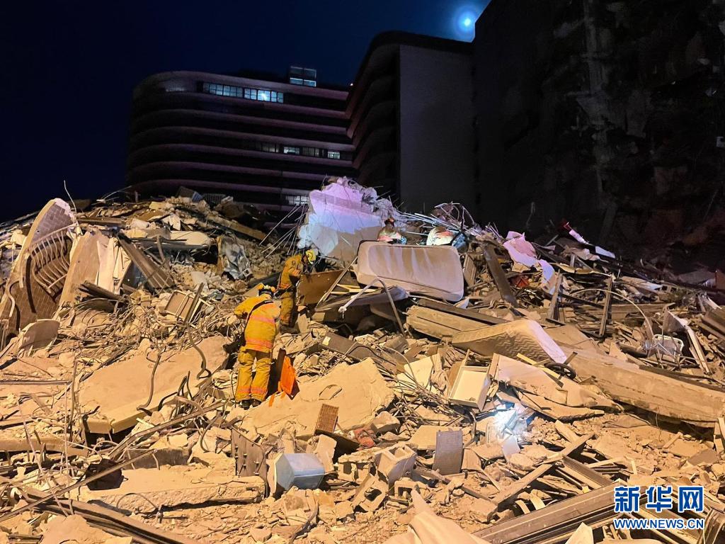 6月24日,救援人員在美國佛羅里達州一棟發生局部坍塌的住宅樓廢墟上搜救。