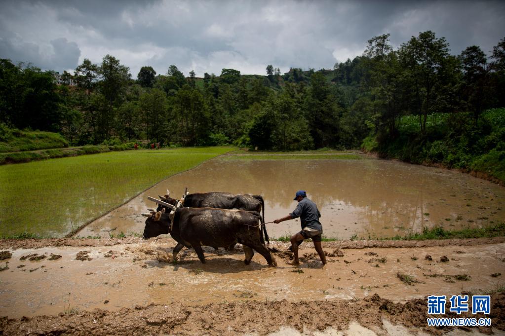 6月29日,農民在尼泊爾中部勒利德布爾附近的稻田里耕作。