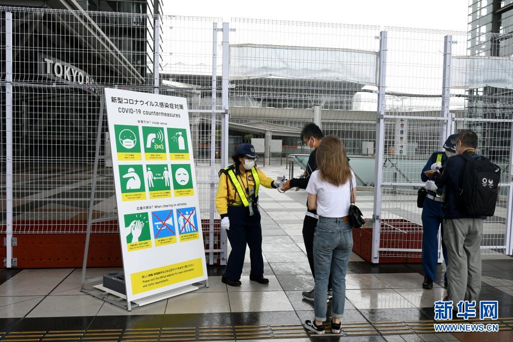 7月1日,工作人員在奧運(yùn)會(huì)主新聞中心入口檢查證件和測(cè)量體溫。新華社記者 華義 攝