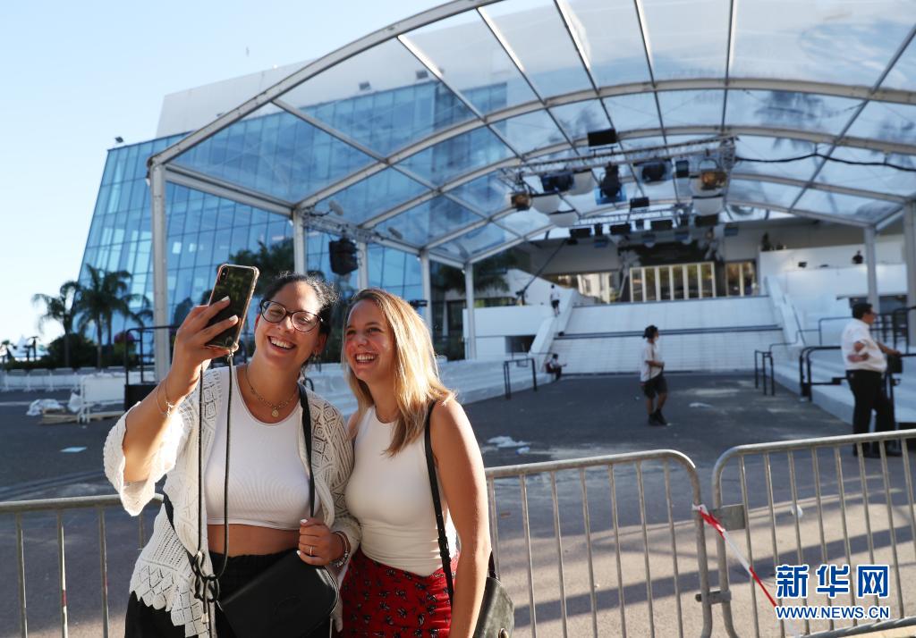 7月5日,人們在法國戛納的電影宮外拍照留念。