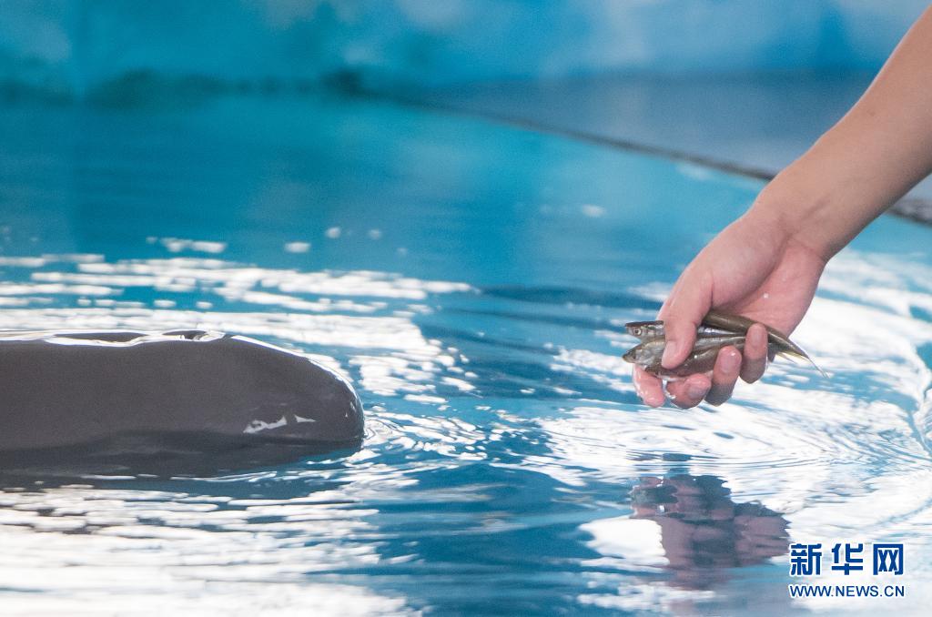 7月5日,中科院水生所白鱀豚館飼養員給長江江豚喂食。新華社記者肖藝九攝