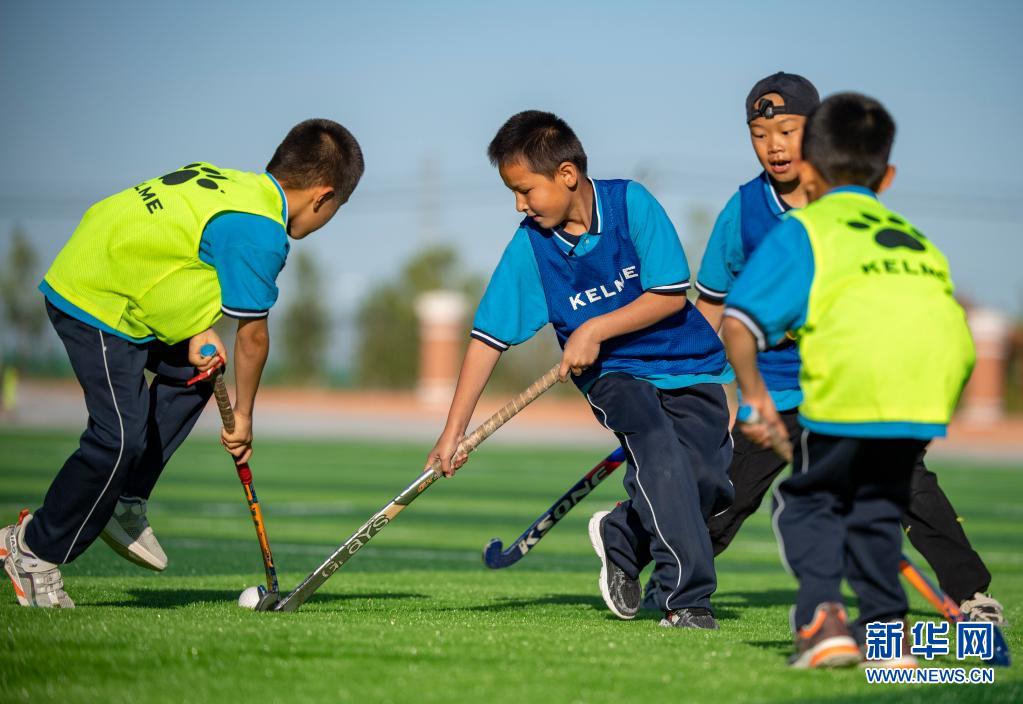 塔城市第二小學曲棍球隊的小隊員們在訓練賽上拼搶(6月13日攝)。