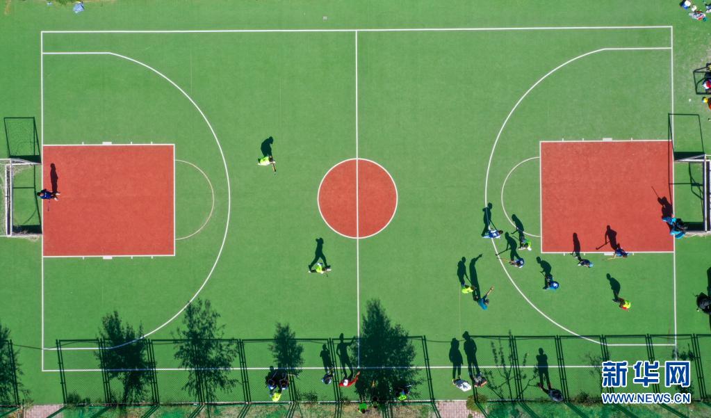 塔城市第二小學(xué)曲棍球隊(duì)的小隊(duì)員利用周末時(shí)間進(jìn)行練習(xí)(6月12日攝,無人機(jī)照片)。