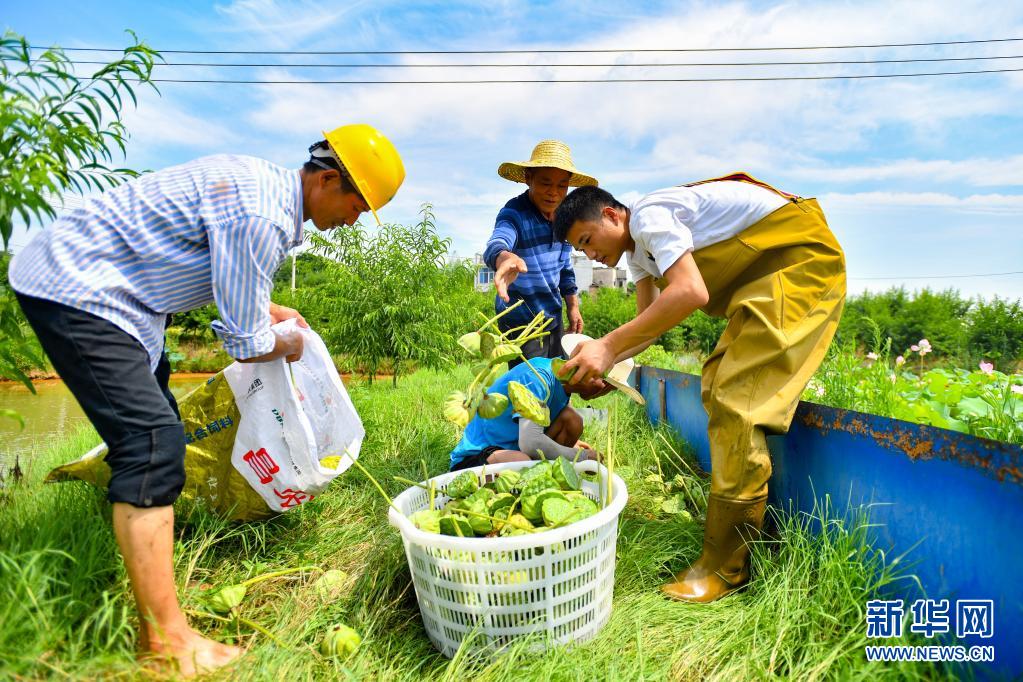 7月11日,在湖南省湘潭市雨湖區姜畬鎮聯映村,蓮農將采摘好的蓮蓬裝筐。新華社記者 陳澤國 攝