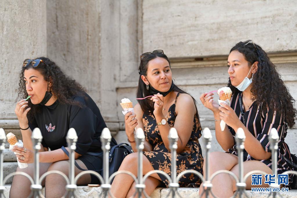 7月11日,人們在意大利羅馬吃冰淇淋消暑。