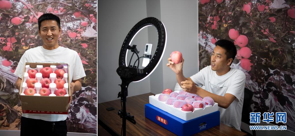拼版照片:左圖為郭鋒杰展示山西省吉縣產的蘋果;右圖為郭鋒杰通過網絡直播銷售蘋果(7月9日攝)。今年32歲的郭鋒杰是吉縣古賢村人,常年在外從事建筑行業。吉縣有“蘋果之鄉”的美譽,看到吉縣蘋果在農村電商領域的發展潛力,郭鋒杰經過長期考察后,選擇返鄉創業。返鄉后,他忙著和果農洽談合作,聯系各大商超,自己也開起了網店,做起了“主播”。