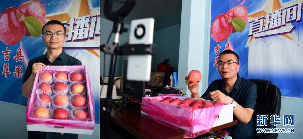 拼版照片:左圖為郭豐瑞展示山西省吉縣產(chǎn)的蘋果;右圖為郭豐瑞通過網(wǎng)絡(luò)直播介紹蘋果(7月9日攝)。今年31歲的郭豐瑞是吉縣南村人,曾在北京打工的他看到農(nóng)村電商的巨大潛力后,于2013年返鄉(xiāng)創(chuàng)業(yè)。2014年,郭豐瑞成立了合作社,同時(shí)開始線上銷售蘋果。隨著網(wǎng)絡(luò)直播熱潮的興起,郭豐瑞開始通過各個(gè)直播平臺(tái)宣傳家鄉(xiāng)的優(yōu)質(zhì)蘋果。