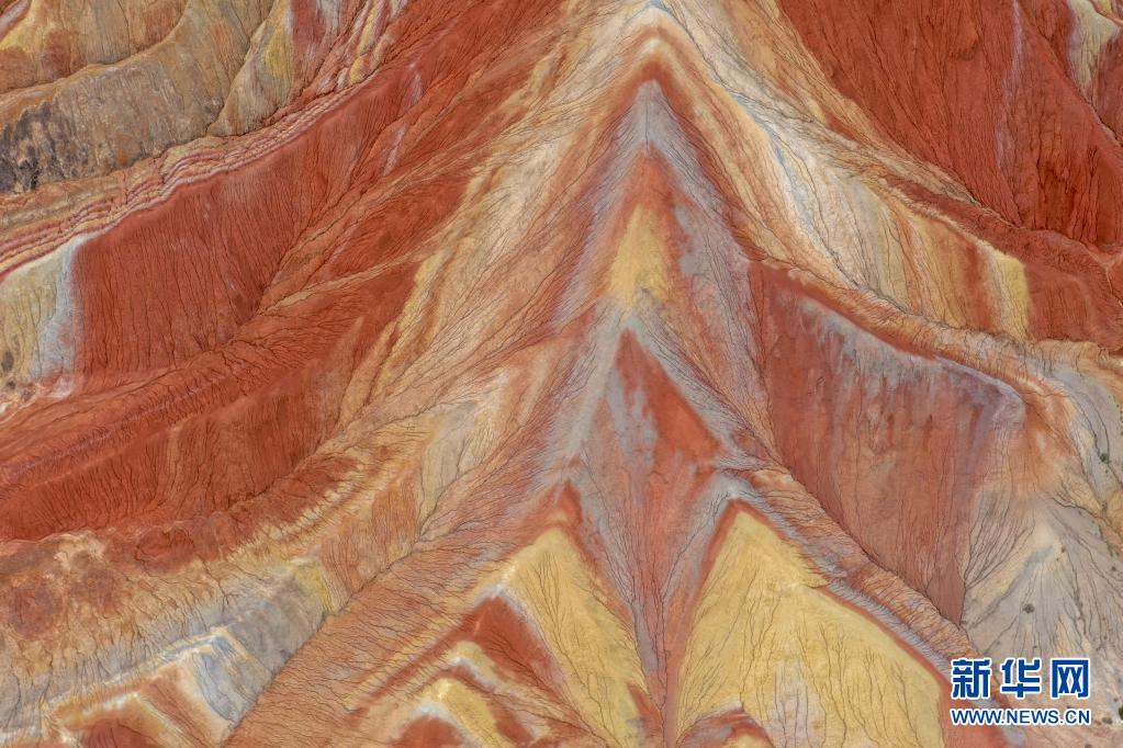 張掖世界地質(zhì)公園的一處彩色丘陵地貌景觀(7月14日攝,無(wú)人機(jī)照片)。